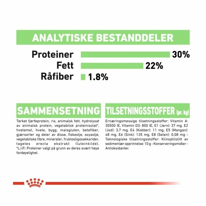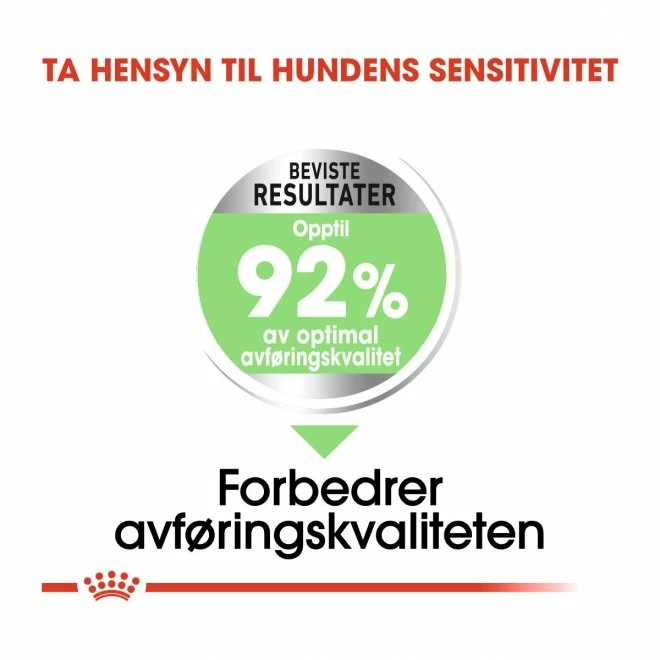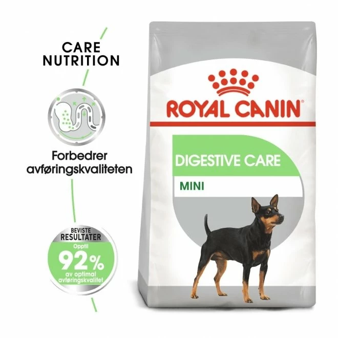 Royal Canin mini digestiv care er til små og følsomme hunder. En følsom fordøyelse kan resultere i myk og illeluktende avføring, og derfor har Mini Digestive Care en eksakt og balansert næringsformel som støtter en optimal tarmhelse. Innholdet av svært lettfordøyelige proteinkilder (L.I.P.), prebiotika (FOS) fremmer en balansert tarmflora og forbedrer avføringskvaliteten.