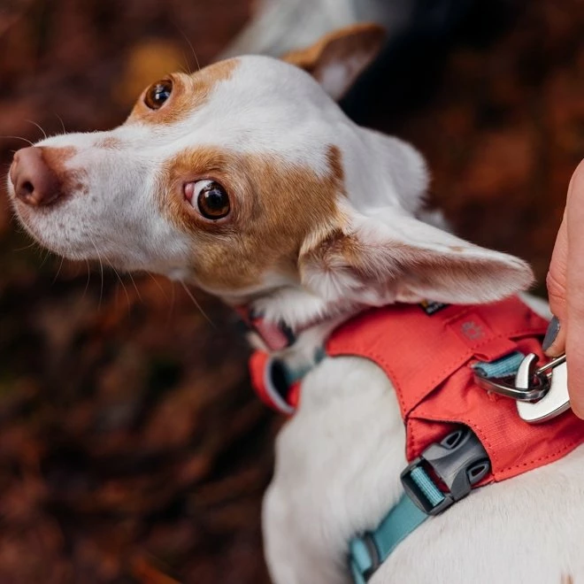 RuffWear Hi & Light Hundesele har to sterke båndfester, ett aluminiumfeste på ryggen og ett solid nylonfeste på brystet.