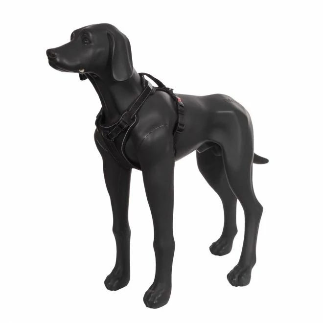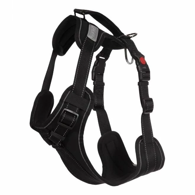 Rukka-selen har et håndtak oventil, slik at du kan ta tak i hunden hvis du må løfte den eller holde igjen litt ekstra. Hundeselen kan justeres rundt både midje og hals med spennen. Båndet festes i ringen på ryggen.