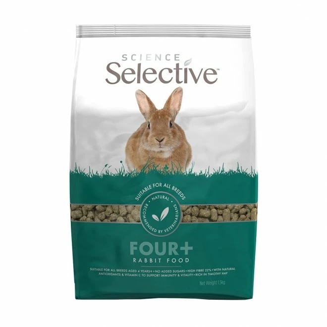 Supreme Science Selective Rabbit Four + er et kaninfôr med fantastiske egenskaper som er tilpasset for seniorkaninen! Fôrkulene er harde for å slipe naturlig på tennene og er fullspekket med næring av høy kvalitet, slik at den eldre kaninen din skal kunne opprettholde helsen og vitaliteten sin! Fôrkulene hindrer dessuten at kaninen velger ut enkelte godbiter, noe som er vanlig når man gir müsliblandinger.