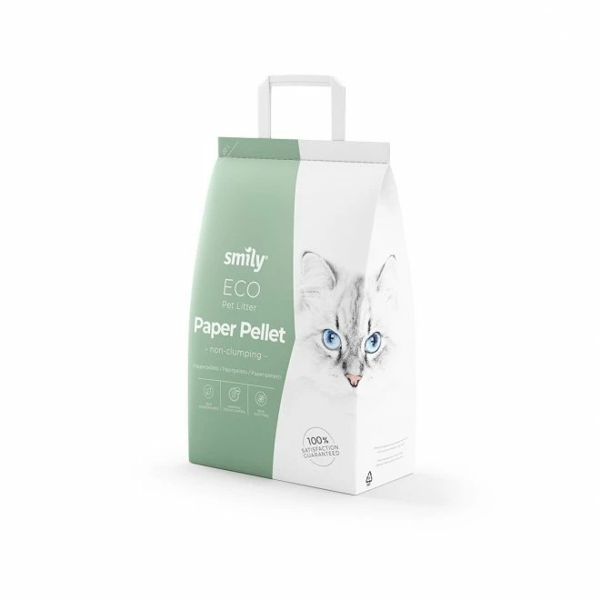 Pelleten er biologisk nedbrytbar og kan legges i komposten etter bruk. I tillegg er den fullstendig støvfri siden papirmassen er omformet til pellet. Den er heller ikke klumpdannende, noe som gjør Smily Eco papirpellet til et godt alternativ for sensitive katter, kattunger og smådyr som kanin, hamstre og marsvin. Papirpelleten sørger også for at katten ikke drar med seg masse kattesand rundt i hjemmet.