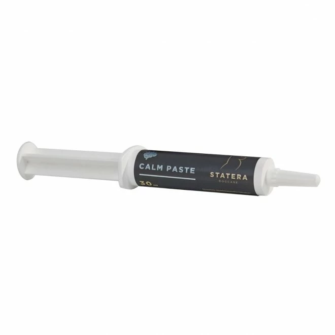 Statera Dogcare Calm Paste inneholder blant annet beroligende urter, 5 ulike typer B-vitaminer, magnesium og tryptofan. Tilskuddet regulerer signalene i hundehjernen som varsler om fare – på den måten blir hunden rolig uten å bli sløv og avstumpet.