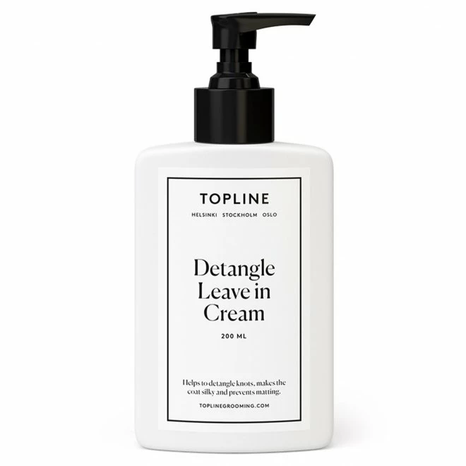 Topplinje Detangle Leave In Cream inneholder de aktive virkestoffene bomullsolje og bambusekstrakt. De fungerer ved at de fukter pelsen og Hvitaliserer den.