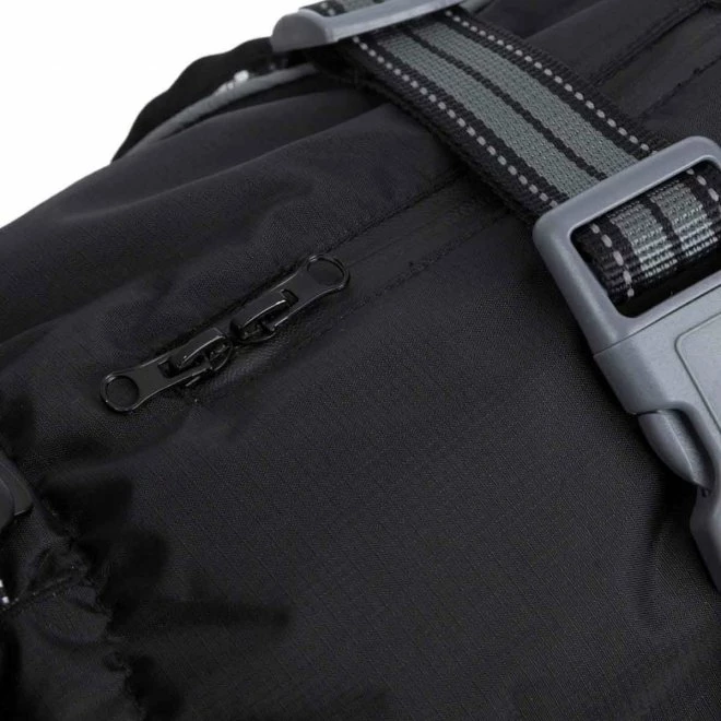 Plagget har en høy, justerbar krage som kan tilpasses etter værforholdene. Magereim og stropper på bakbeina kan justeres, slik at du får optimal passform ut ifra hundens egen kropp.