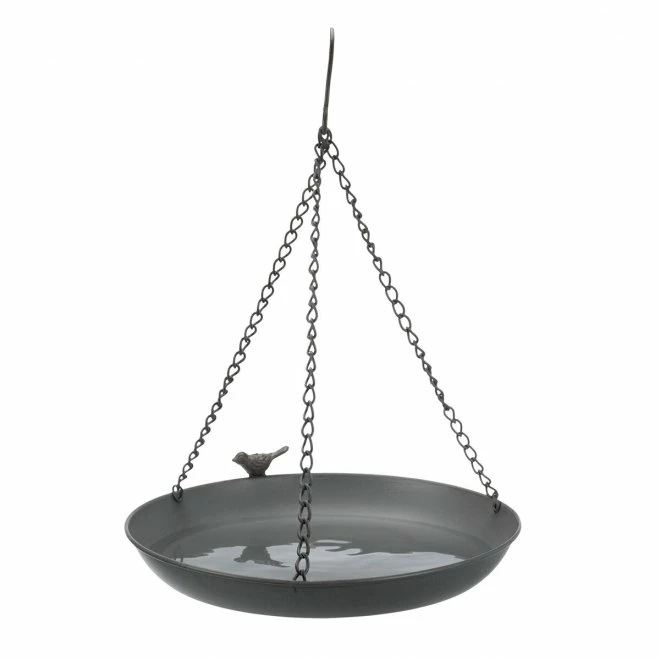 Dette fuglebadet er laget av metall og henger fra tre små kjeder. Fuglebadet er lett å henge opp i for eksempel et tre, slik at du kan se fuglene bade fra vinduet. Et fuglebad er en fin detalj å ha i hagen – det er morsomt å se på fuglene, og du gjør dem også en tjeneste!
