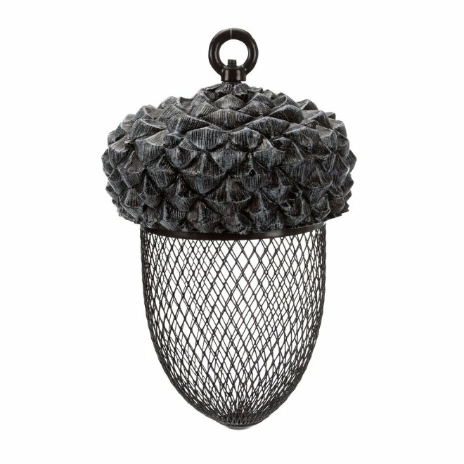 Denne villfuglmateren er utformet som en stor eikenøtt og er et skikkelig blikkfang! Materens overdel er laget av harpiks, mens bunnen kommer i finmasket metallnetting som sørger for at små fuglenebb får tak i den deilige maten. Fuglemateren henges enkelt opp i trær og fylles ved å skru på lokket – utrolig praktisk! Villfuglmateren er særlig egnet for fôring med peanøtter, men kan også brukes til talgboller. Beholderen rommer ca. 700 ml fôr.