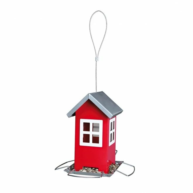 Kjempesøt og opphengbar fuglemater utformet som en rød liten hytte! Dette blir et veldig fint innslag i hagen som vi tror fuglevennene dine vil sette stor pris på! Materen er laget av metall, der undersiden består av et brett med fire bøyler som fuglene kan sitte på mens de spiser av maten. Fuglemateren har et søtt lite vindu med hvite karmer hvor man kan se om det begynner å bli tomt for fôr. Vinduet er også en fin liten detalj. Man kan enkelt fylle på ved å løfte opp taket og helle i frøblandingen. Utrolig praktisk! Denne villfuglmateren rommer ca. 1000 ml fôr.