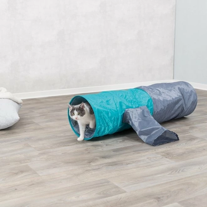Trixie Polyester Kattetunnel er en spennende, ruslende tunnel som katter elsker. 4 åpninger som gjør at katten kan ligge på lur i tunnelen og deretter lekent angripe og overraske både kattekompiser og mennesker. Kattetunnel er egnet for bruk både innendørs og utendørs bruk, og leveres i assorterte farger. Dimensjoner 115 x 30cm.
