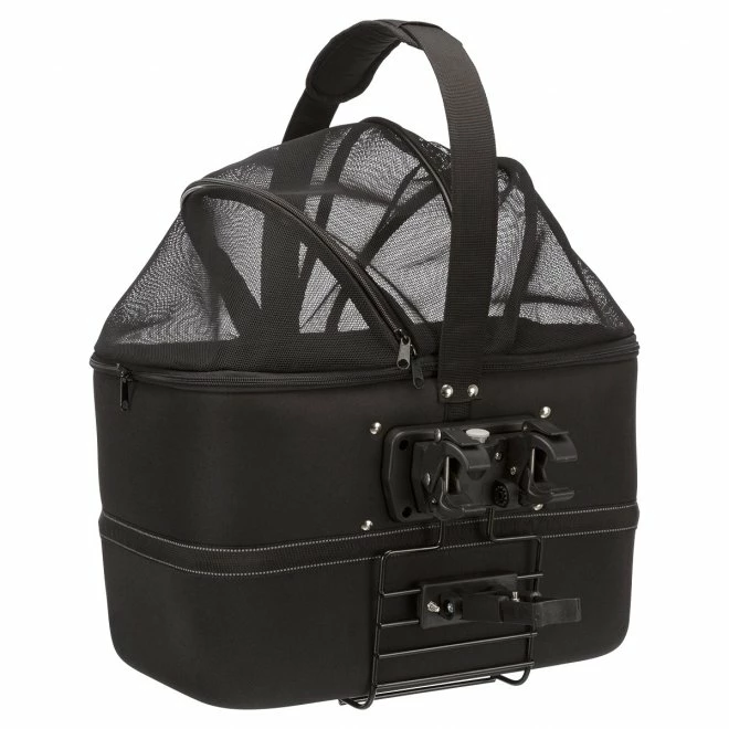 En sykkelkurv tilpasset styret. Kurven er lett å ta av takket vært hurtiglås. Taket er tilvirket av nett som gir bra luftsirkulasjon og forhindrer at dyret ditt kan hoppe ut. Inngår er også gjennomskinnelig regnbeskyttelse som dras over kurven, i tillegg til et innebygd bånd som forhindrer at dyret kan hoppe ut av kurven. Bunnen er sklifri. Kan også fint brukes som transportveske. Produsert i formbevarende EVA-materiale. Mål 41 × h47 × 39 cm. Farge: Svart. Passer hunder og katter opptil 6kg.
