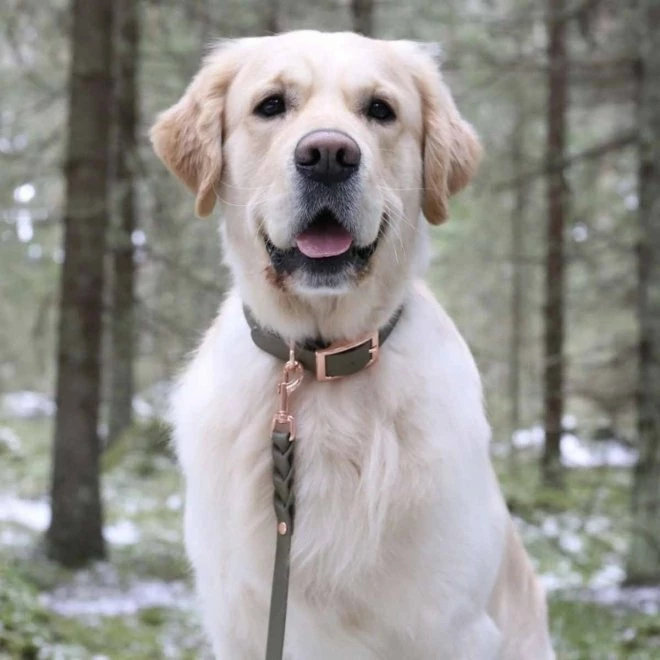 Vil du matche halsbånd og kobbel i olivengrønn farge, anbefaler vi Tyylivoitto Flettet Hundekobbel Olivengrønn.