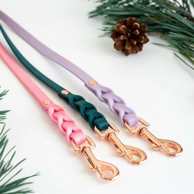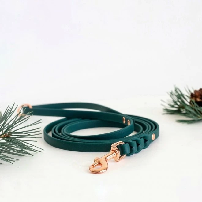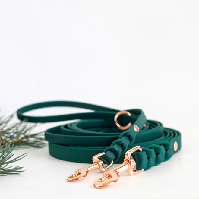 Tyylivoitto har designet en vakker skogsgrønn farge på sine kobler og halsbånd, som passer helt perfekt til høstens skogsturer. Metalldetaljene i roségull matcher den skogsgrønne fargen og sørger for at hunden blir den peneste i byen, hundeparken eller på skogsturen.